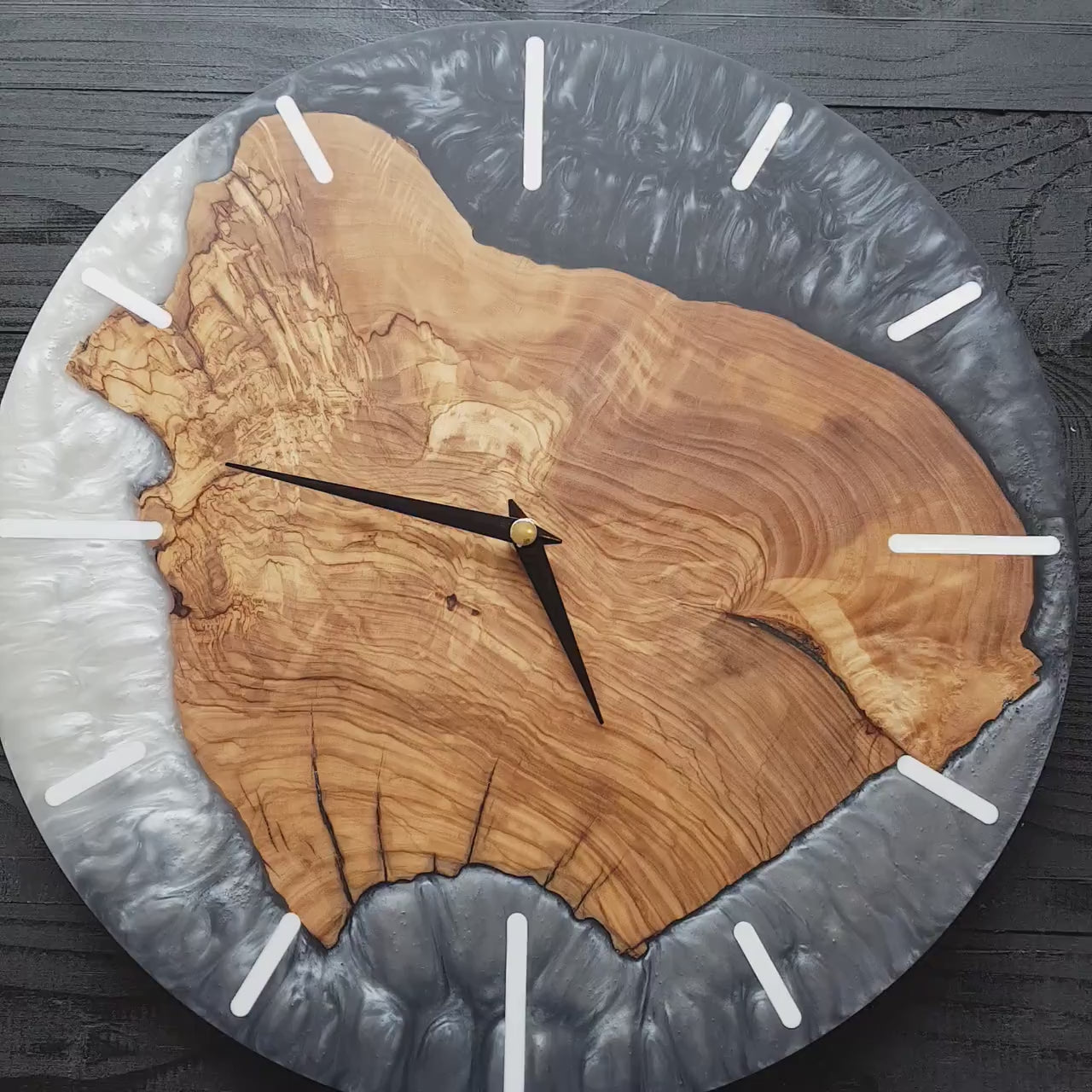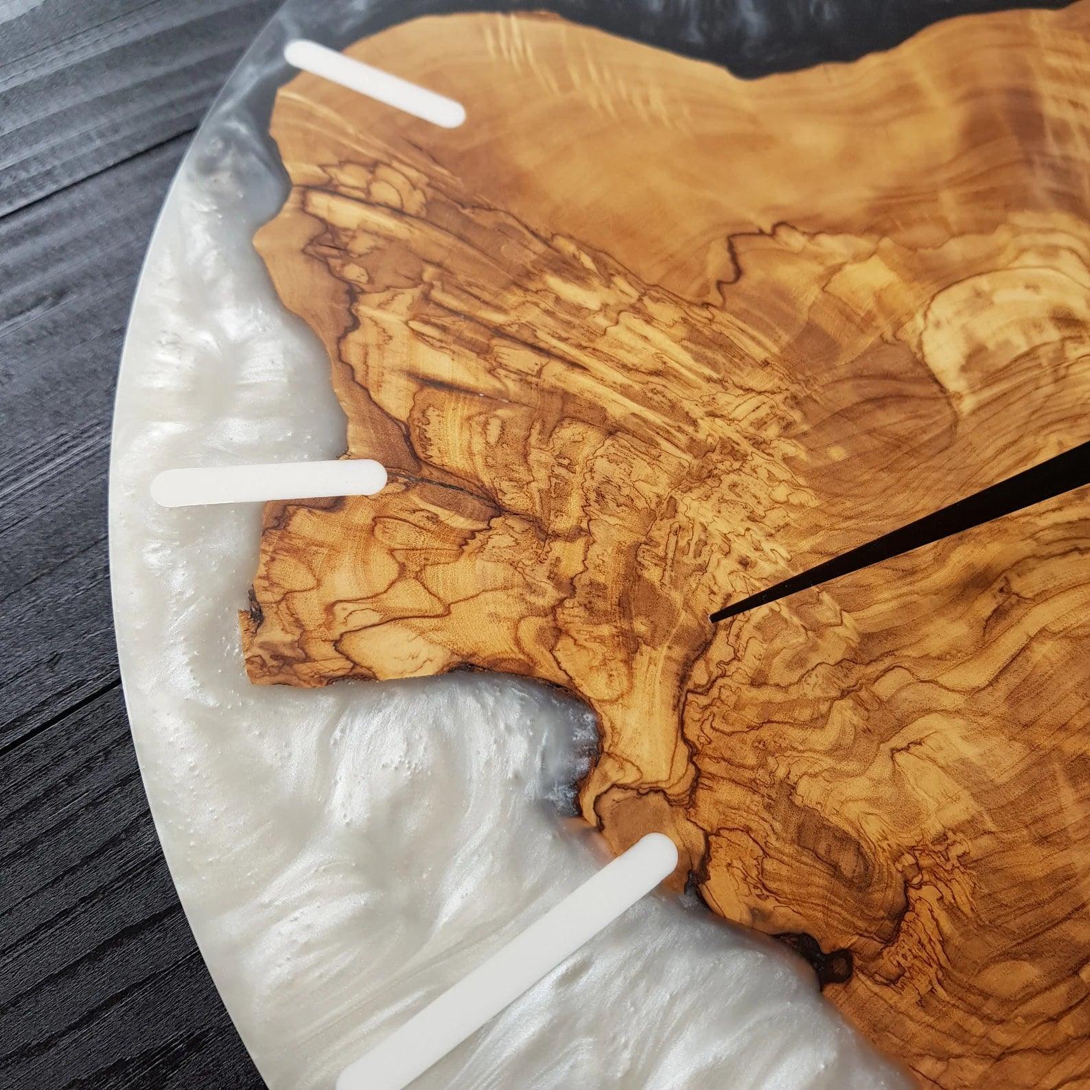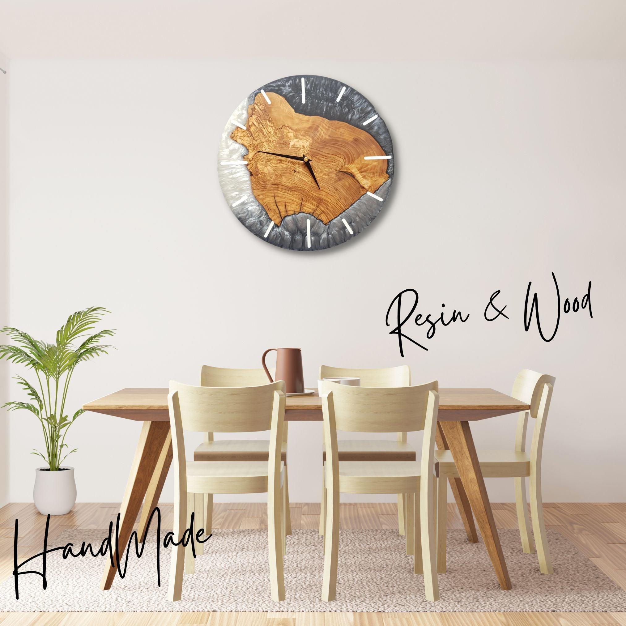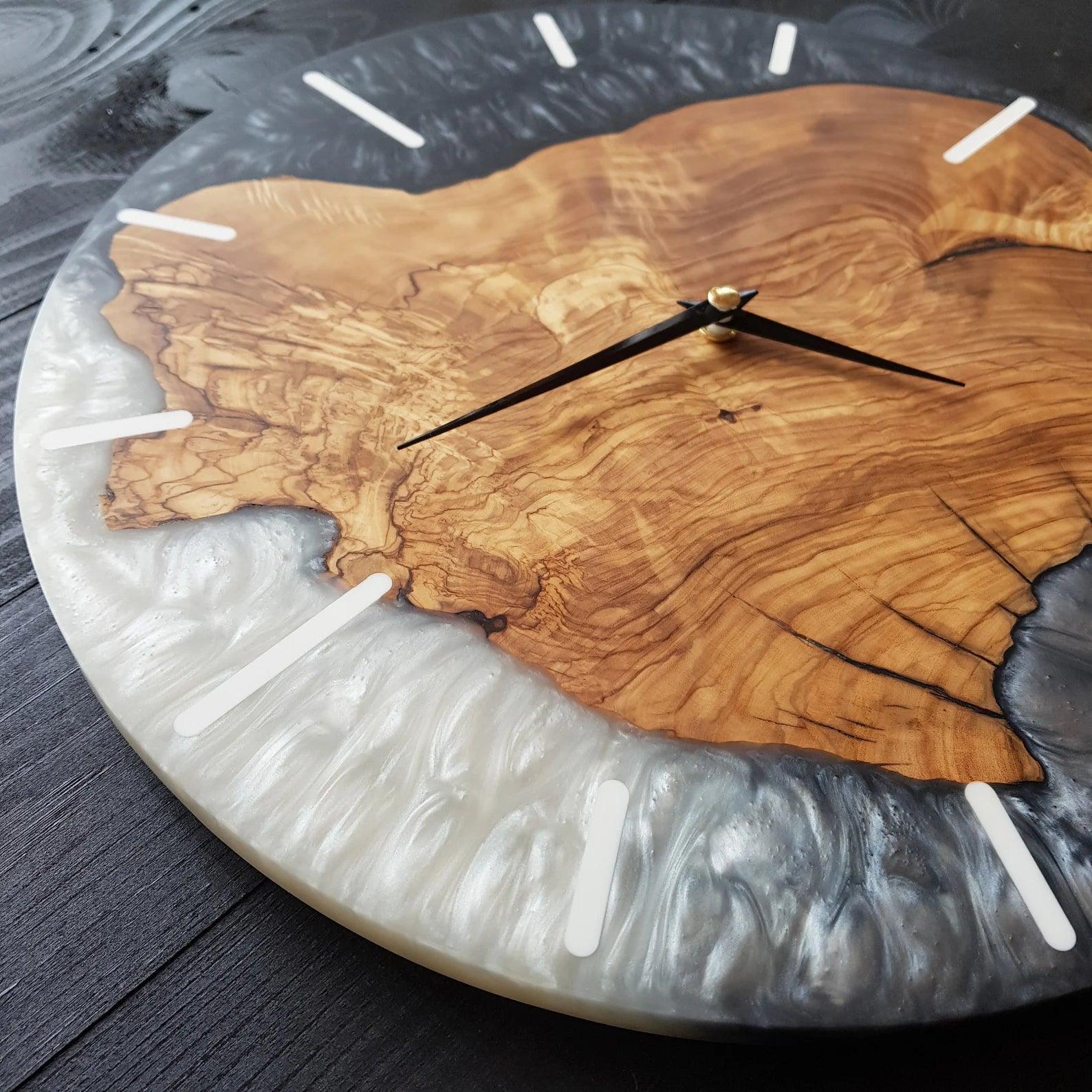 Ancak bu saat yalnızca doğal bir malzeme harikası değil — ahşabın rustik dokusunu ve reçinenin modern ışıltısını bir araya getiren büyüleyici bir sanat eseridir.