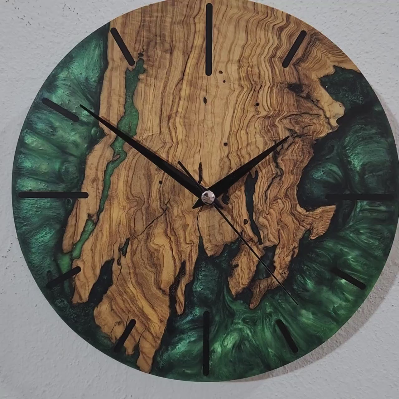 Green Forest Wooden & Resin Wall Clock, doğal zeytin ağacının sıcak dokusunu canlı yeşil reçine detaylarıyla buluşturarak yemyeşil bir ormanın dinginliğini evinize getirir. Her saat özenle el işçiliğiyle üretilir, bu nedenle iki parça birbirinin aynısı değildir — her biri doğanın imzasını taşır.