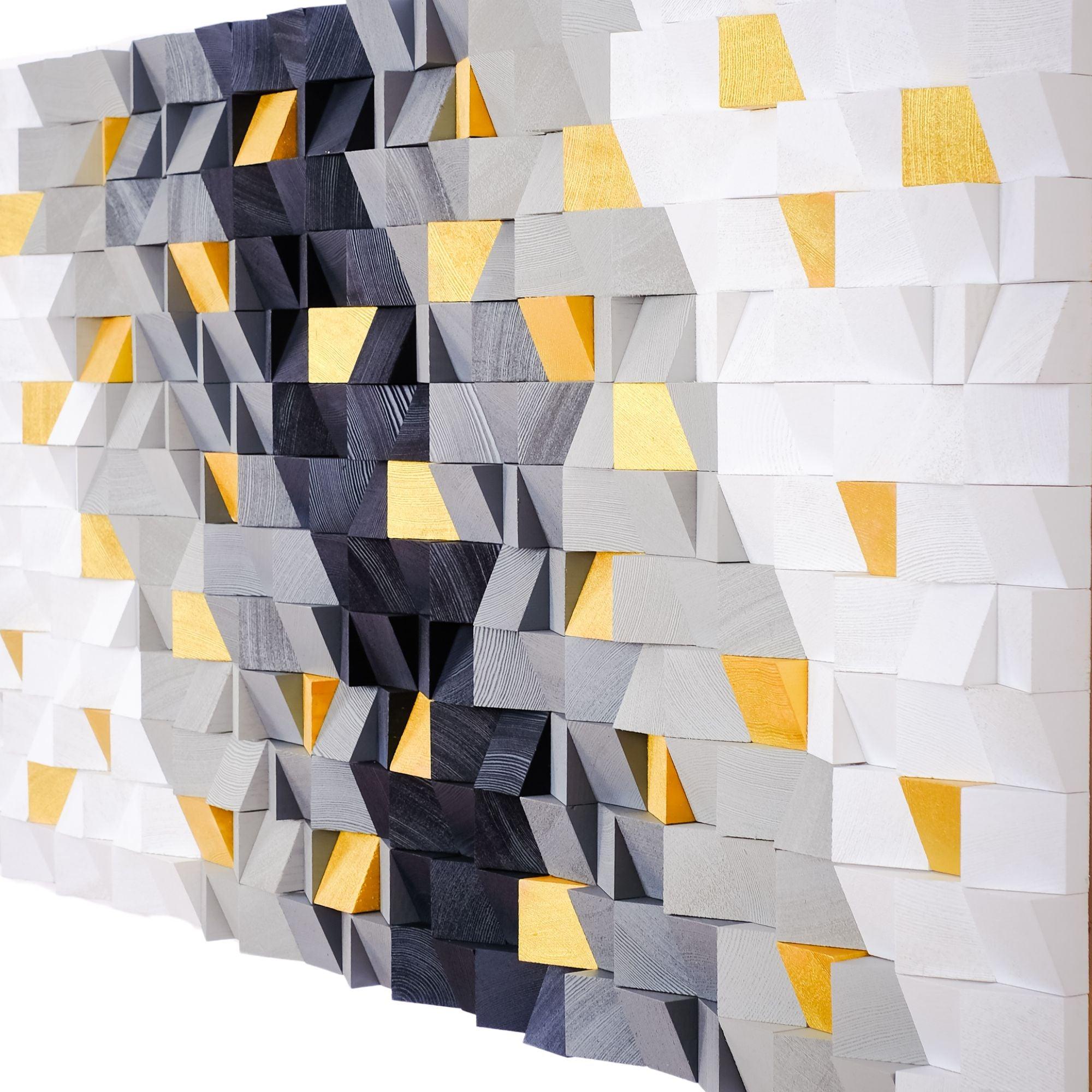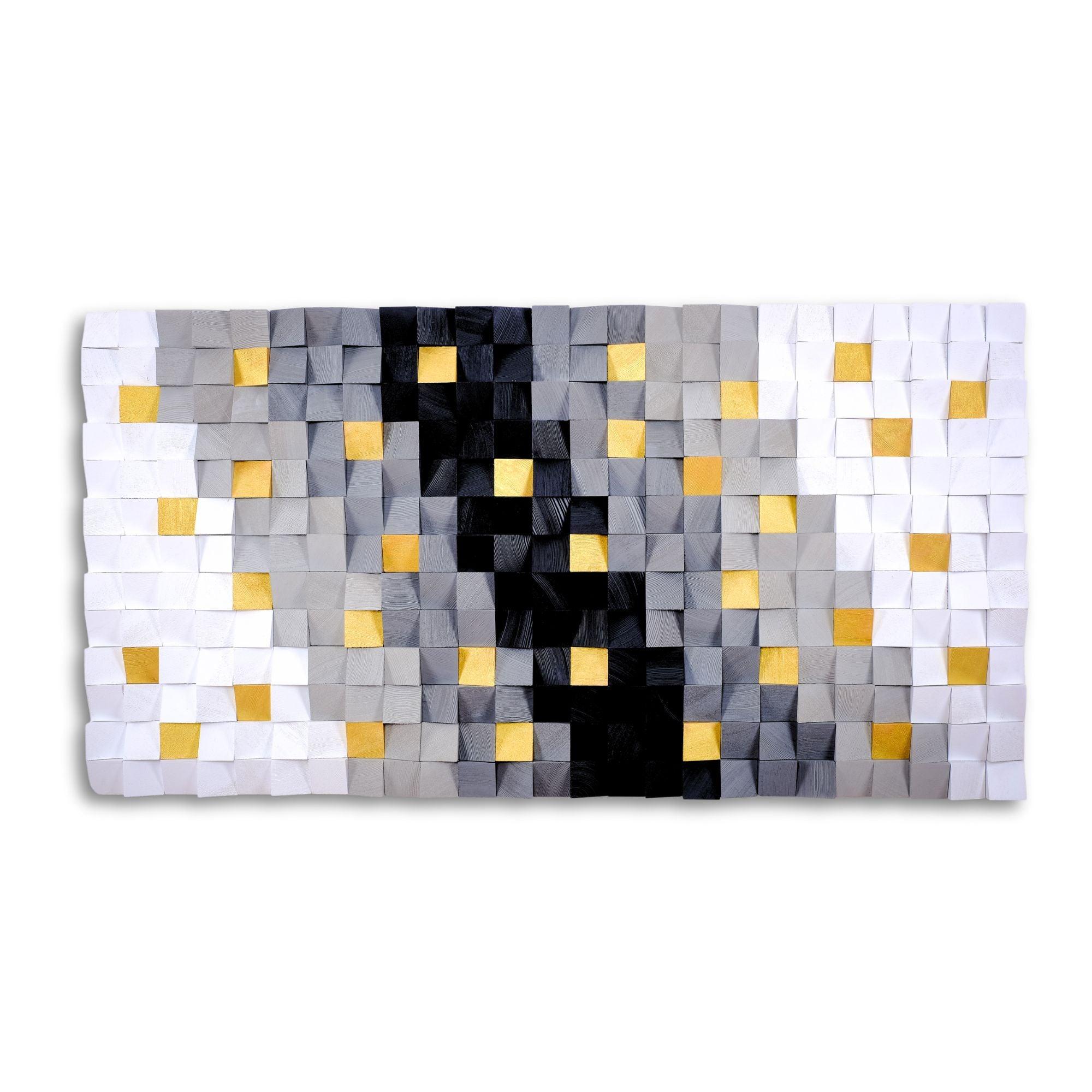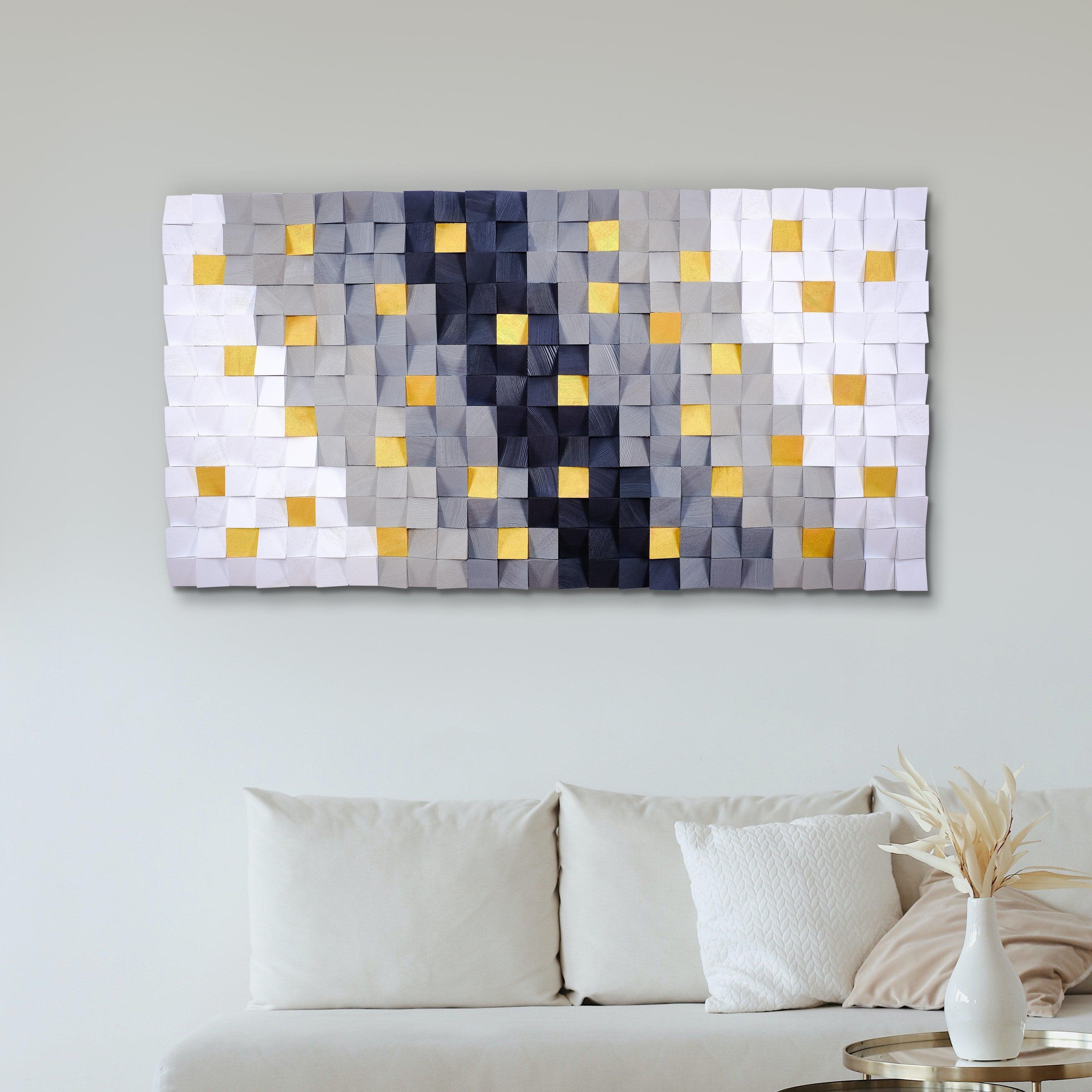 - In this remarkable rustic wooden wall decor series, our designers cut each small cube by hand and sand them individually. These pieces are painted separately with premium coloring to enhance their beauty and shield the wood at its finest. After painting and drying, the parts are attached to a wooden surface by a maximum-hold adhesive.