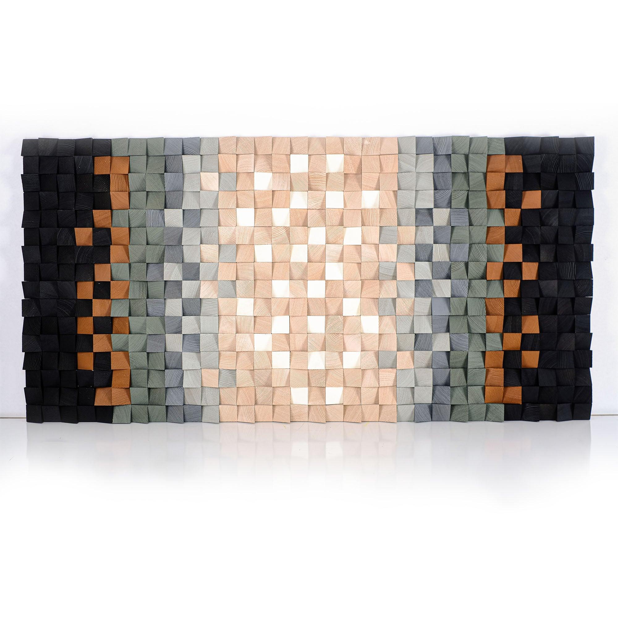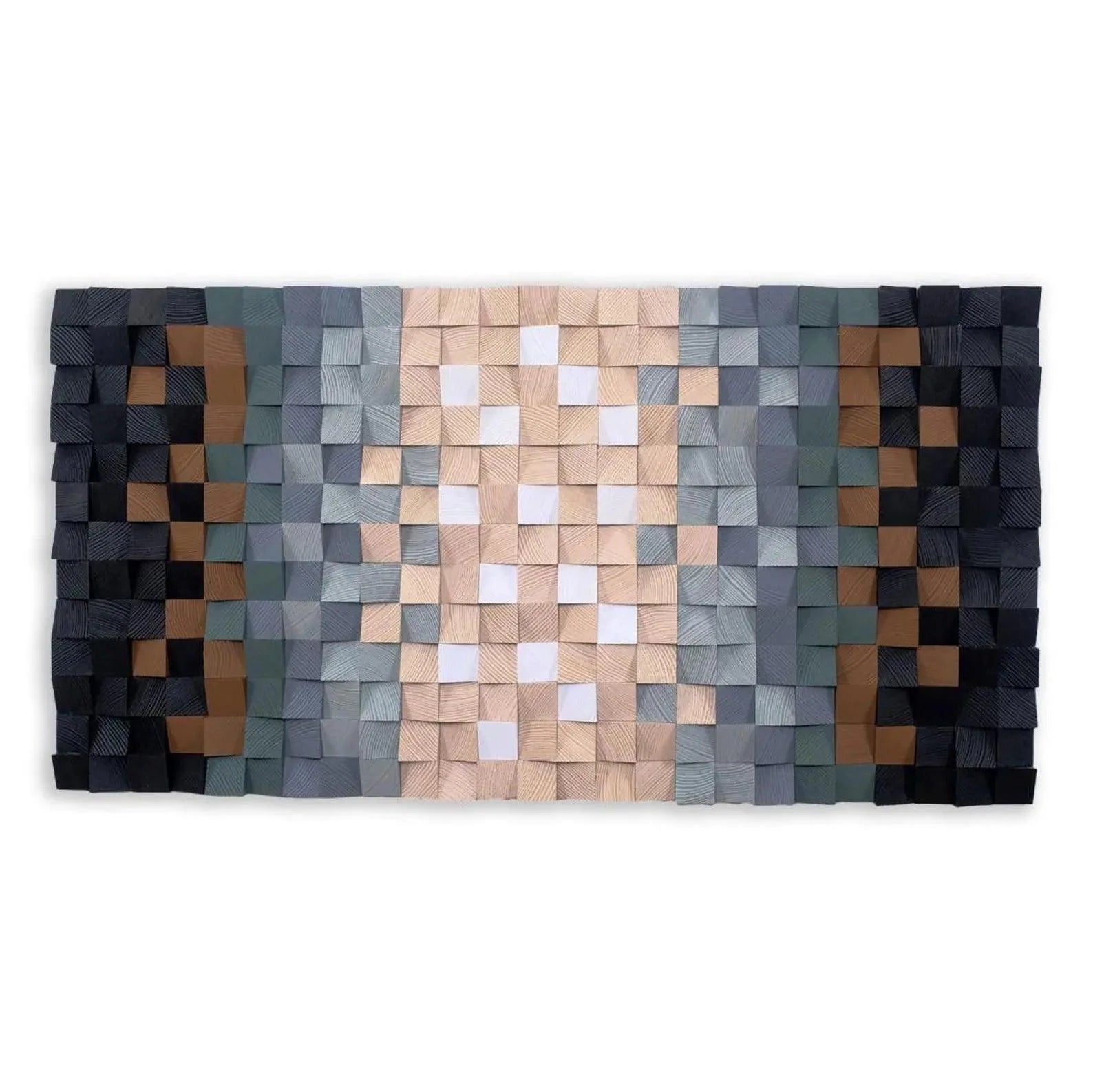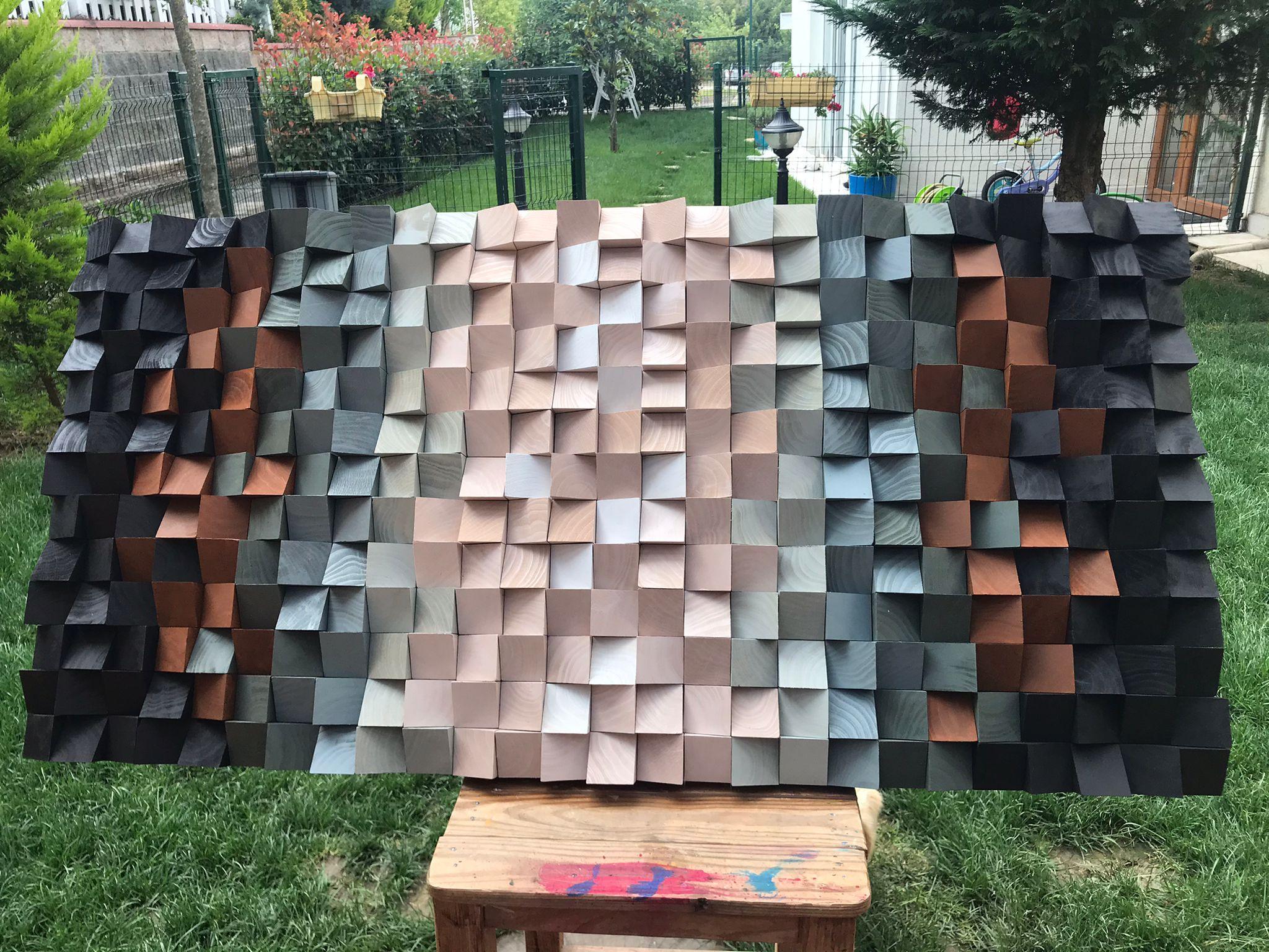 Bu özel rustik ahşap duvar dekoru serisinde, tasarımcılarımız her küçük küpü tek tek elde keser ve ayrı ayrı zımparalar. Her parça, estetiğini artırmak ve ahşabı en iyi şekilde korumak için premium boyalar ile ayrı ayrı boyanır. Boyama ve kuruma işleminin ardından parçalar, maksimum tutuş sağlayan güçlü bir yapıştırıcı ile ahşap yüzeye sabitlenir.