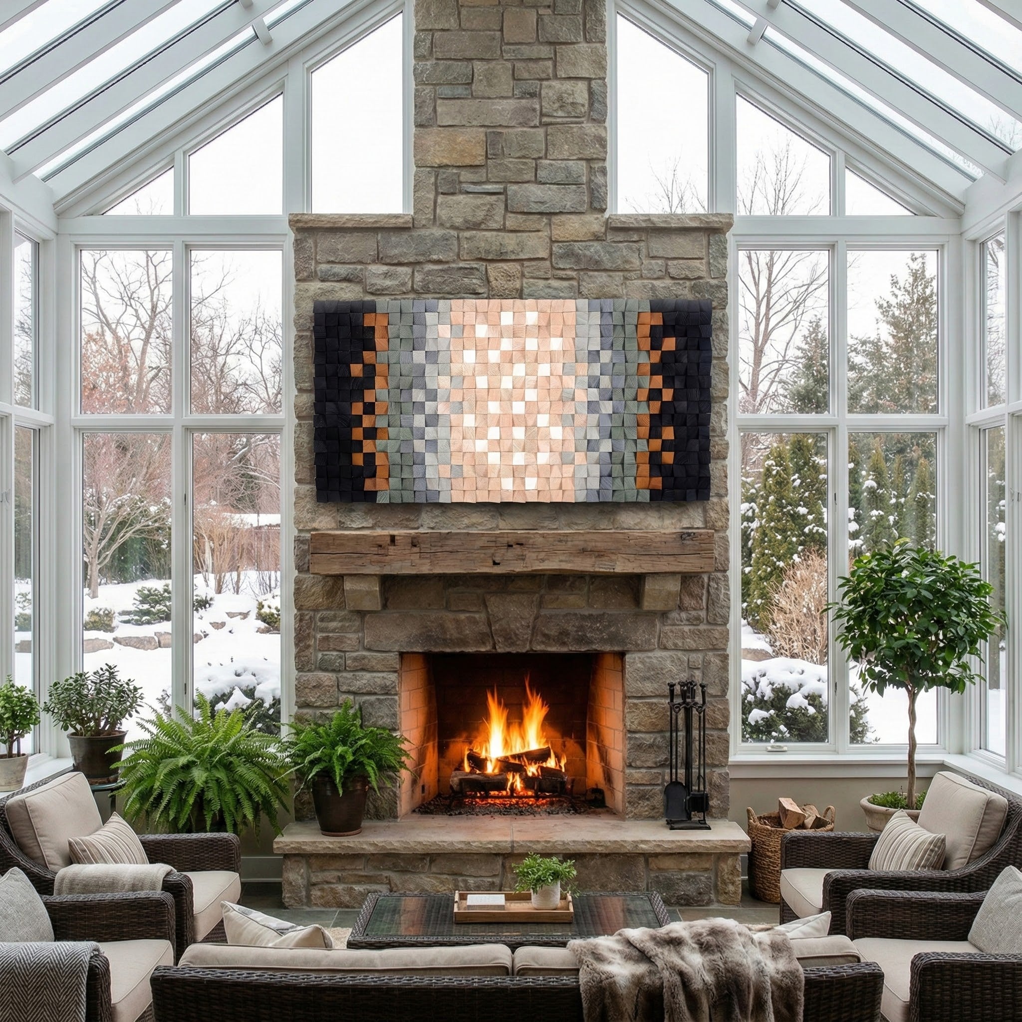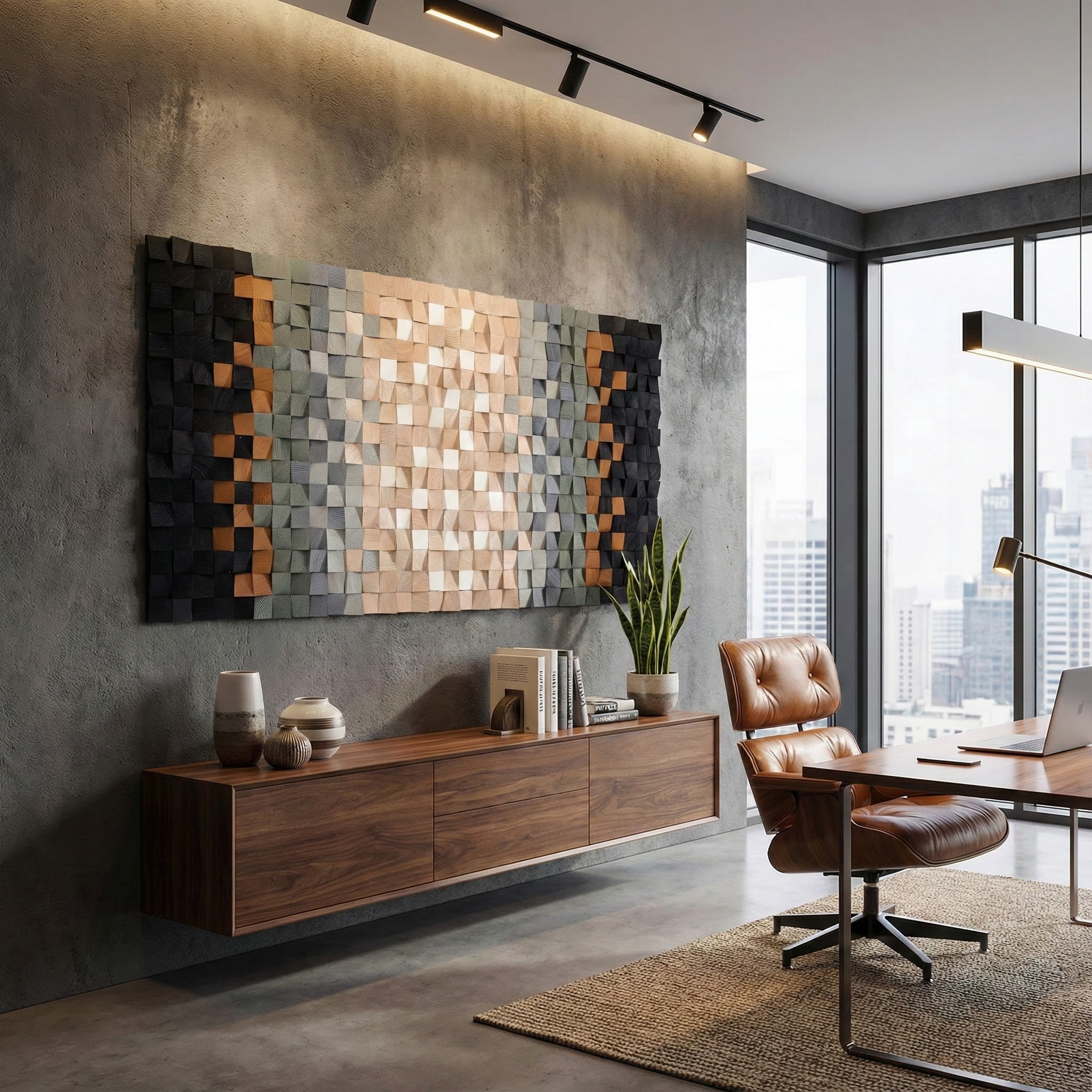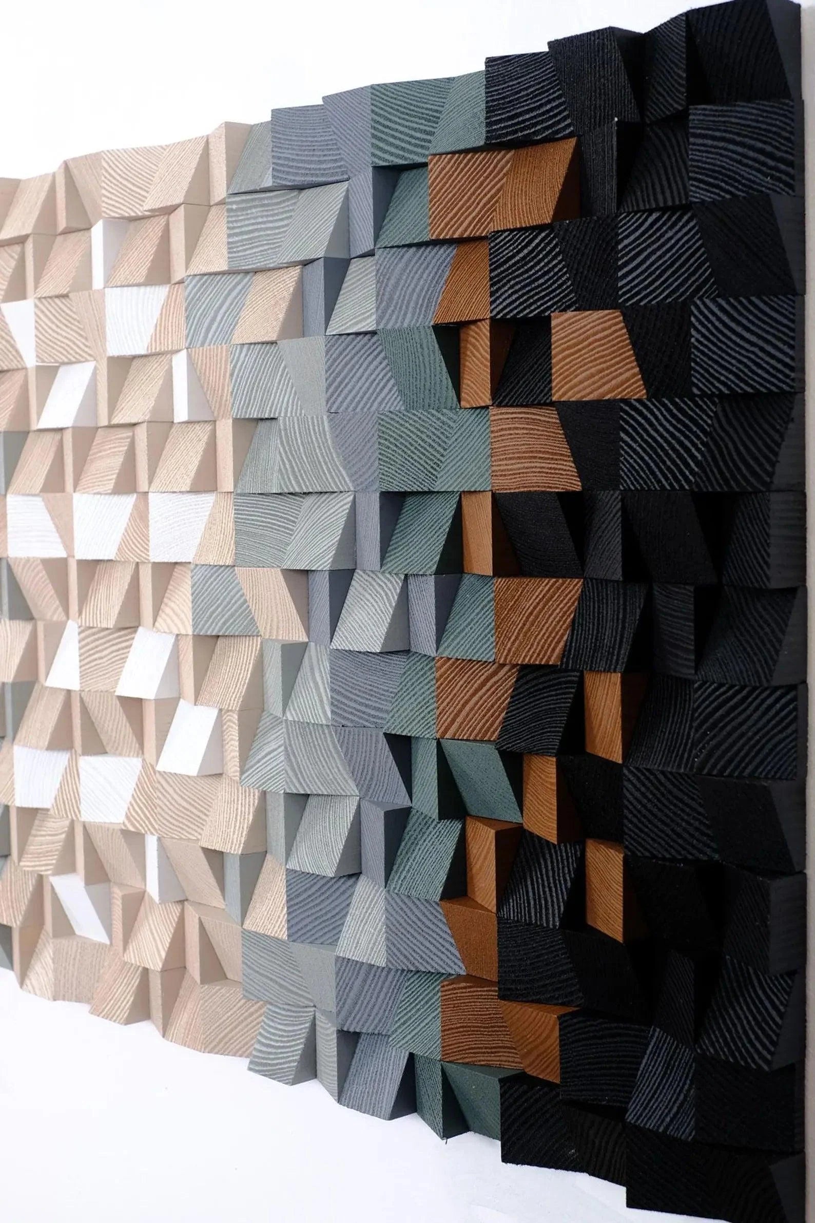 Bu özel rustik ahşap duvar dekoru serisinde, tasarımcılarımız her küçük küpü tek tek elde keser ve ayrı ayrı zımparalar. Her parça, estetiğini artırmak ve ahşabı en iyi şekilde korumak için premium boyalar ile ayrı ayrı boyanır. Boyama ve kuruma işleminin ardından parçalar, maksimum tutuş sağlayan güçlü bir yapıştırıcı ile ahşap yüzeye sabitlenir.