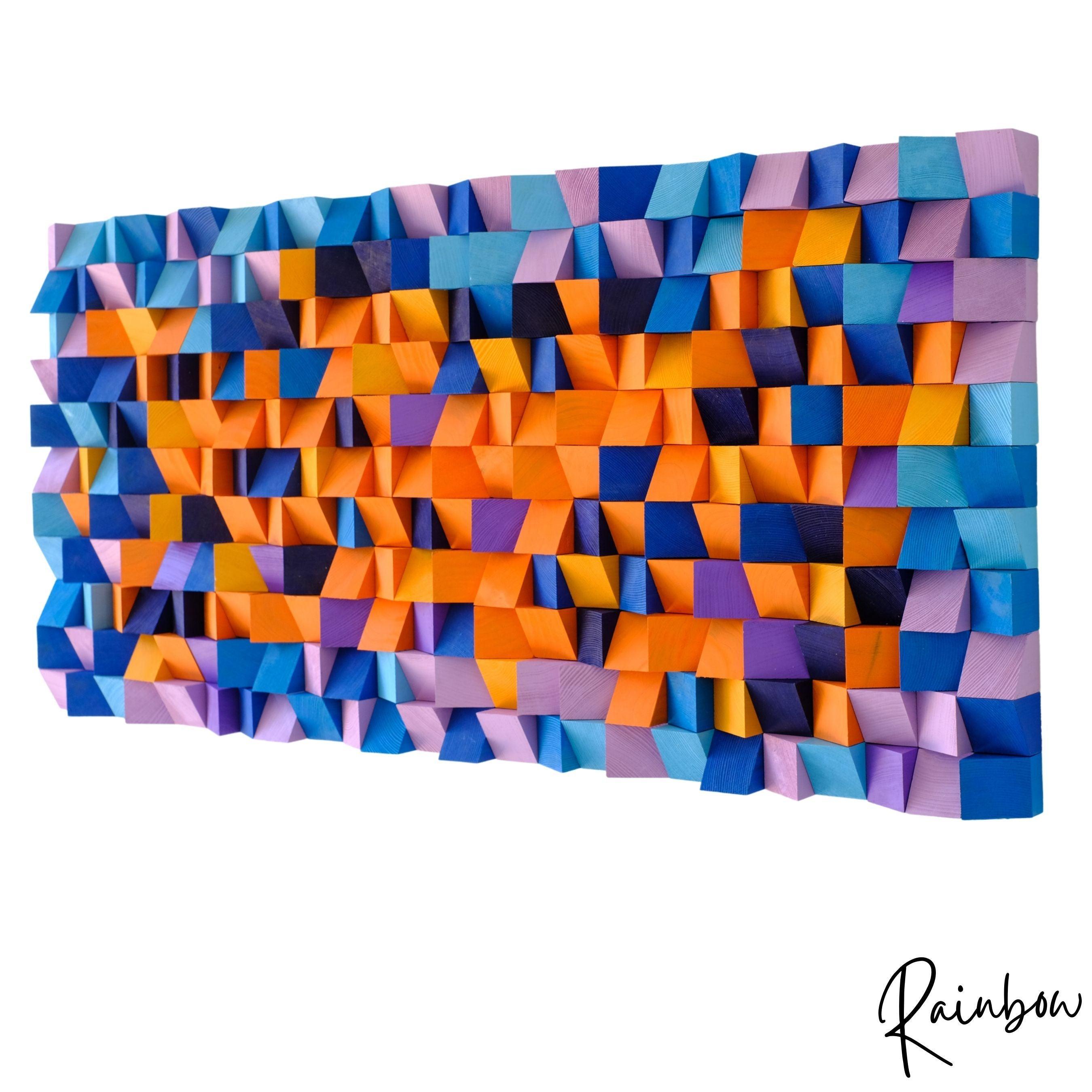 - In this remarkable rustic wooden wall decor series, our designers cut each small cube by hand and sand them individually. These pieces are painted separately with premium coloring to enhance their beauty and shield the wood at its finest. After painting and drying, the parts are attached to a wooden surface by a maximum-hold adhesive.