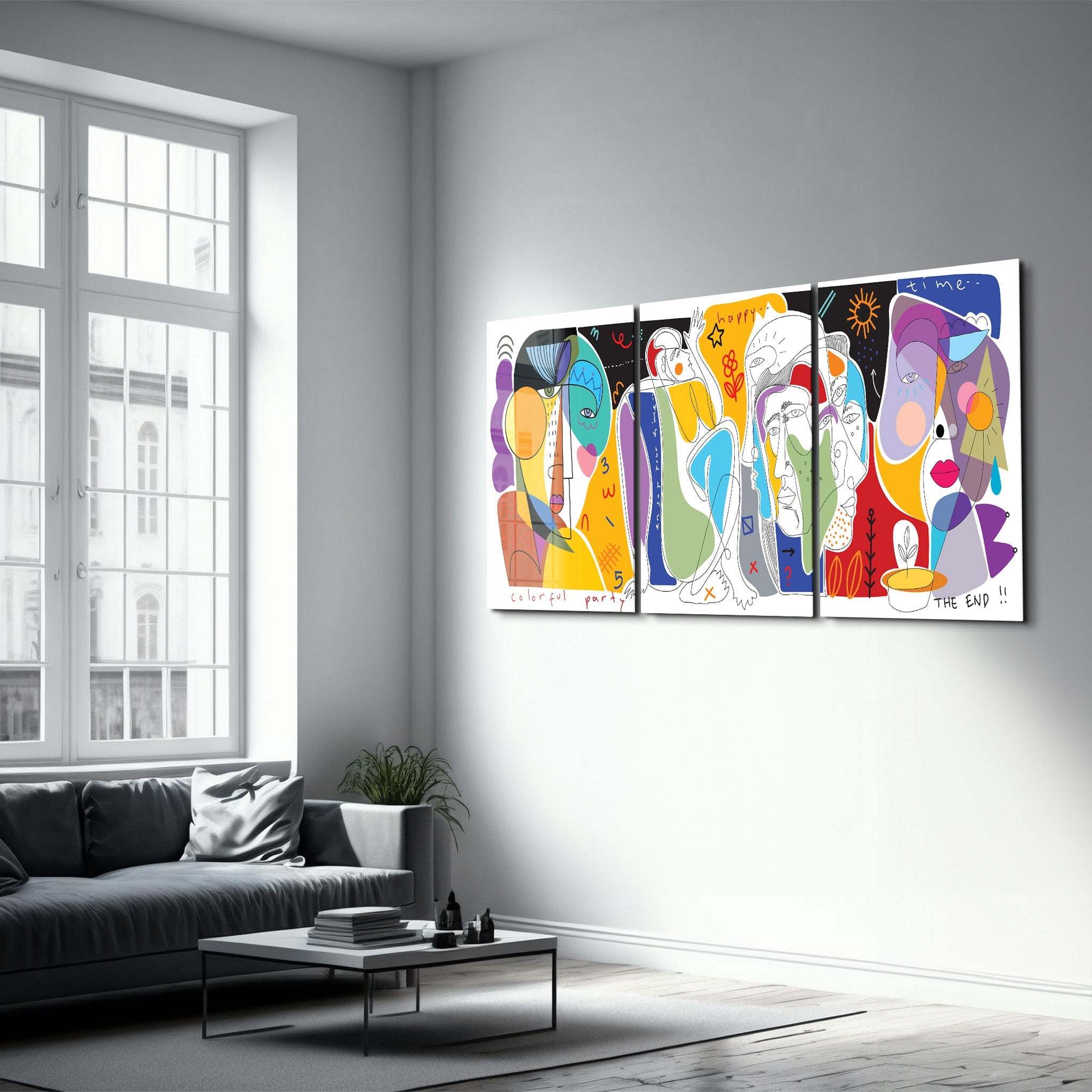 Renkli Parti Soyut Yüzler Üçlüsü - Cam Duvar Tablosu