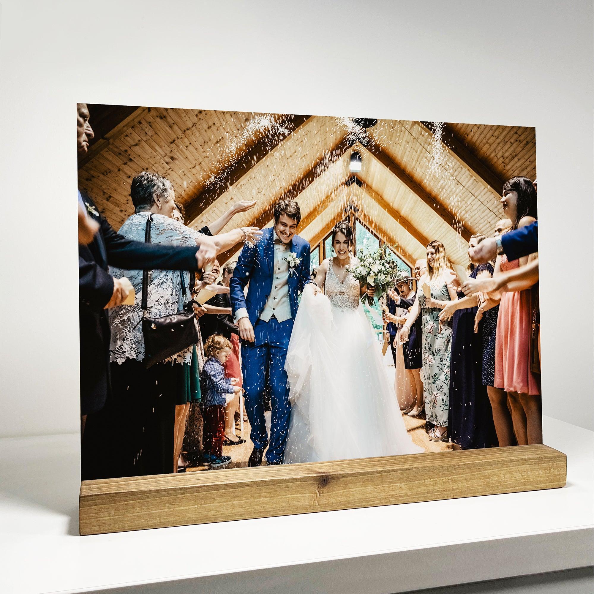 Our personalized glass product is the perfect way to celebrate your wedding, anniversary, or any other special occasion in a unique and stylish way. And with many different options to choose from, you can select the perfect display option for your needs. You can go with our stunning high-quality wood stand, that comes in Walnut, Cherry, Oak and Beech, or a special metal stand, while the other option boasts a sleek and modern 3M sticker on the back, making it perfect for hanging on your wall.